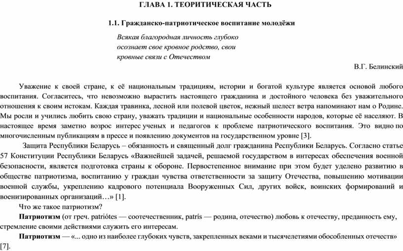 Согласно п. 55 Концепции национальной безопасности Республики Беларусь: «Военно-патриотическое воспитание направлено на формирование у учащихся патриотического сознания, чувства верности своей Родине, готовности к выполнению задач по обеспечению защиты Отечества и овладению необходимыми для этого знаниями, умениями и навыками, а также организацию взаимодействия со всеми потенциальными его субъектами» [2].