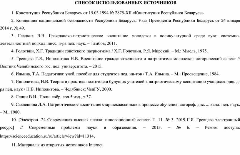 5. Гревцева Г.Я., Ипполитова Н.В. Воспитание гражданственности и патриотизма молодежи: исторический аспект // Вестник Челябинского гос. пед. университета. – 2015.