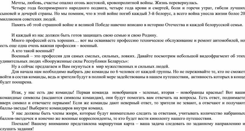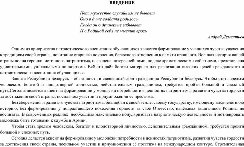 Защита Республики Беларусь – обязанность и священный долг гражданина Республики Беларусь. Чтобы стать зрелым человеком, богатой и плодотворной личностью, действительным гражданином, требуется пройти большой и сложный путь.Сегодня делается акцент на формировании у молодежи потребности в ценностях патриотизма, развитии чувства гордости за достижения своей страны, посильном участии и приумножении ее престижа.