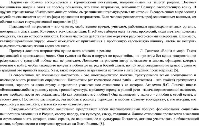 В современном же понимании патриотизм - это многовариантное понятие, трактующееся всеми неоднозначно и имеющее много различных определений. Патриотизм (от греческого слова patris – отечество) – это стойкая гражданская позиция, гордость за свою страну и трепетное уважительное отношение к ее истории. Академик Д.С. Лихачёв писал: «Воспитание любви к родному краю, к родной культуре, к родному городу, к родной речи – задача первостепенной важности, и нет необходимости это доказывать. Но как воспитать эту любовь? Она начинается с малого – с любви к своей семье, к своему дому. Постоянно расширяясь, эта любовь к родному переходит в любовь к своему государству, к его истории, его прошлому и настоящему, а затем ко всему человечеству».