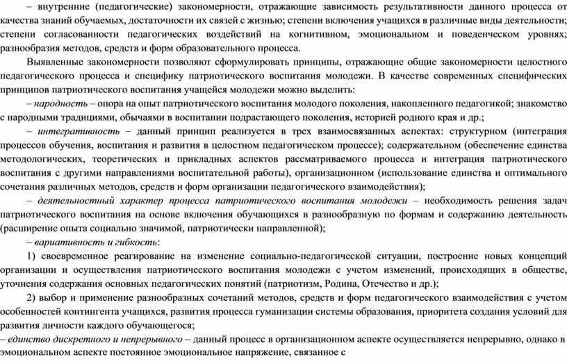 Выявленные закономерности позволяют сформулировать принципы, отражающие общие закономерности целостного педагогического процесса и специфику патриотического воспитания молодежи. В качестве современных специфических принципов патриотического воспитания учащейся молодежи можно выделить: