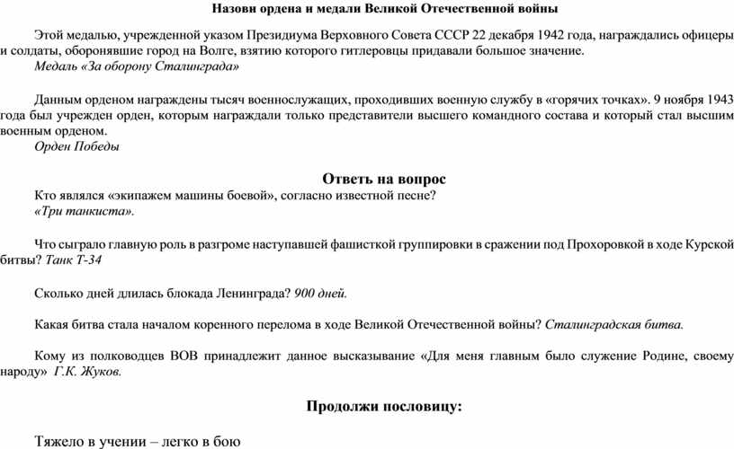 Назови ордена и медали Великой Отечественной войны
