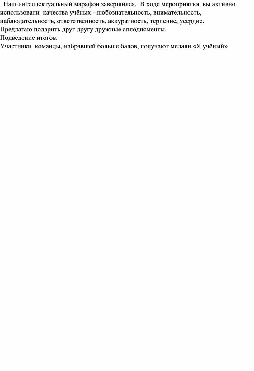Наш интеллектуальный марафон завершился. В ходе мероприятия вы активно использовали качества учёных - любознательность, внимательность, наблюдательность, ответственность, аккуратность, терпение, усердие.