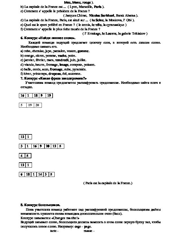 Данная разработка предлагается в качестве проведения внеклассного мероприятия для учащихся 7 - 8 классов, изучающих французский язык в образовательных организациях. Предлагаемый материал способствует повышению уровня мотивации к изучению иностранного языка (французского), формирует положительное отношение к французскому языку, как к средству общения и учебному предмету.