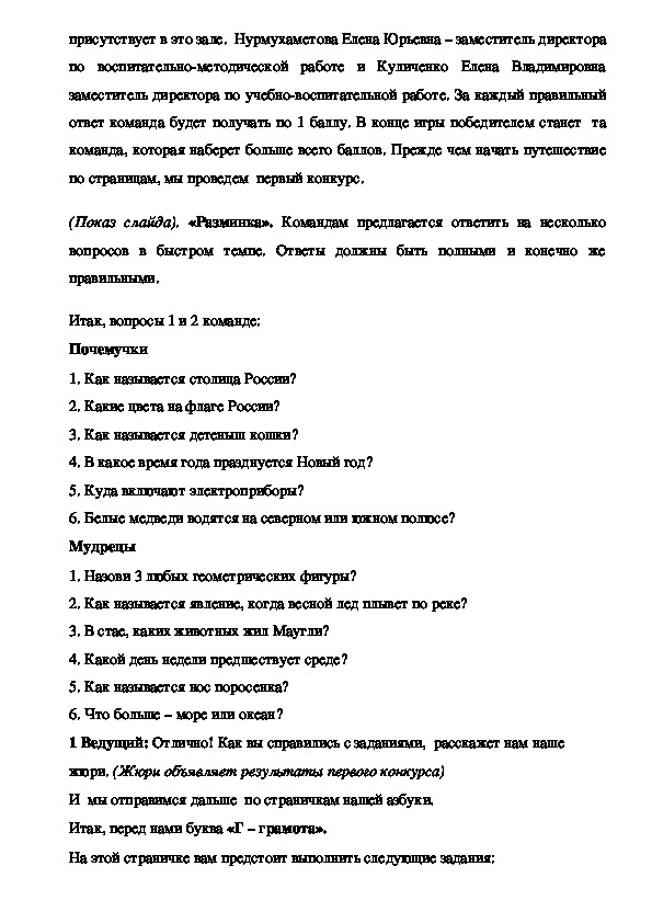 страницам азбуки. А оценивать ваши знания будет жюри, которое такжеприсутствует в это зале. Нурмухаметова Елена Юрьевна – заместитель директора