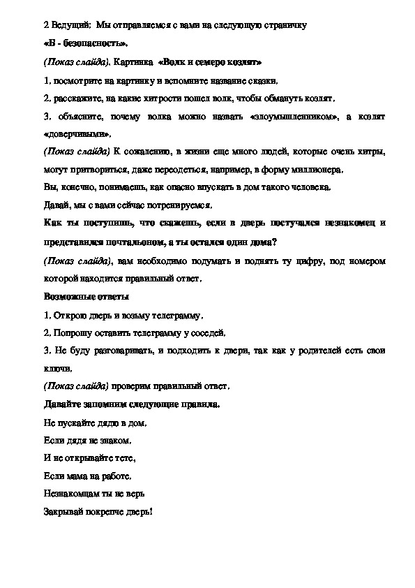«Б безопасность».1. Как ты поступишь, что скажешь, если в дверь постучался незнакомец и представился