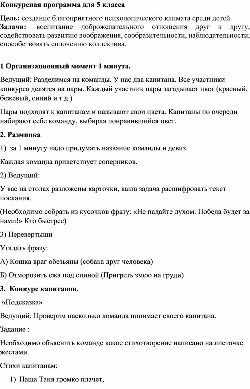 Задачи: воспитание доброжелательного отношения друг к другу; содействовать развитию воображения, сообразительности, наблюдательности; способствовать сплочению коллектива.