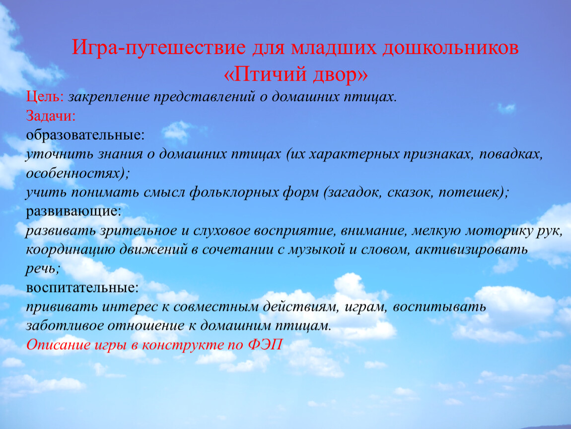 прививать интерес к совместным действиям, играм, воспитывать заботливое отношение к домашним птицам.