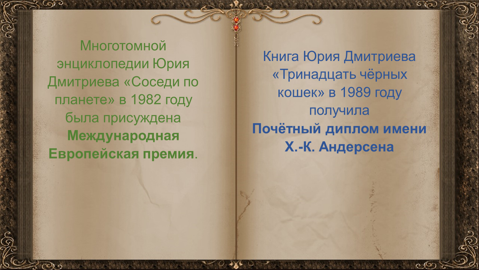 Многотомной энциклопедии Юрия Дмитриева «Соседи по планете» в 1982 году была присуждена Международная Европейская премия.
