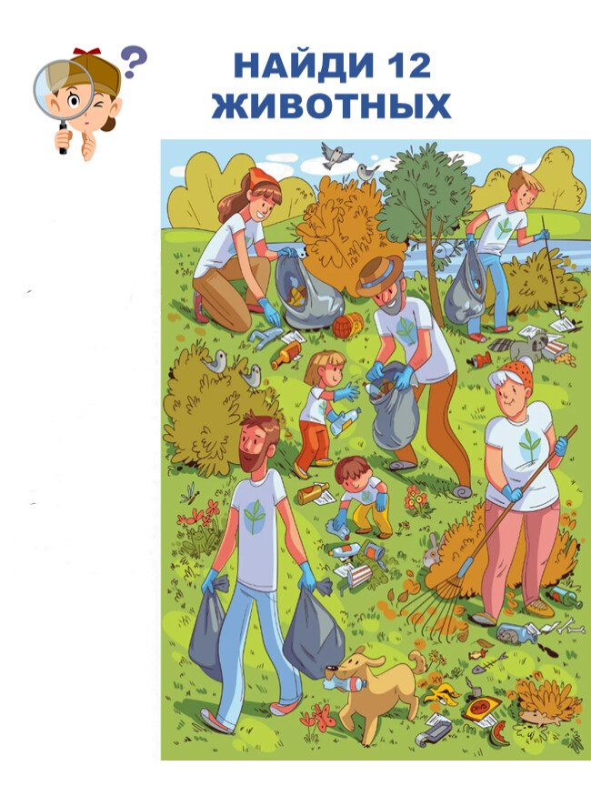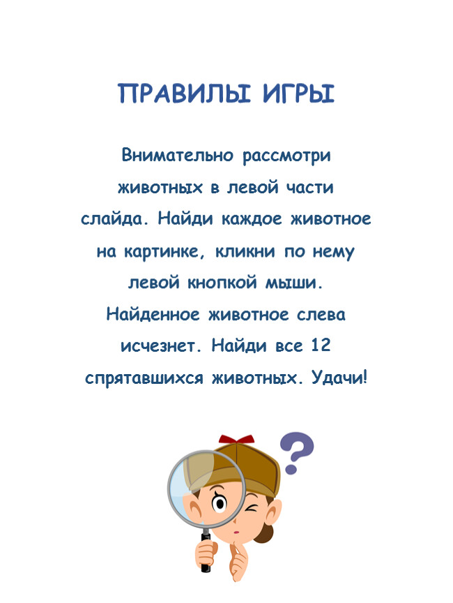 Внимательно рассмотри животных в левой части слайда. Найди каждое животное на картинке, кликни по нему левой кнопкой мыши. Найденное животное слева исчезнет. Найди все 12 спрятавшихся животных. Удачи!