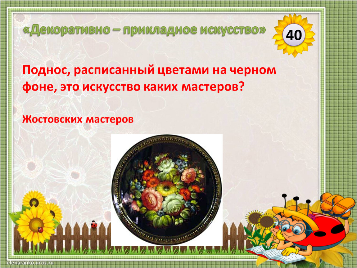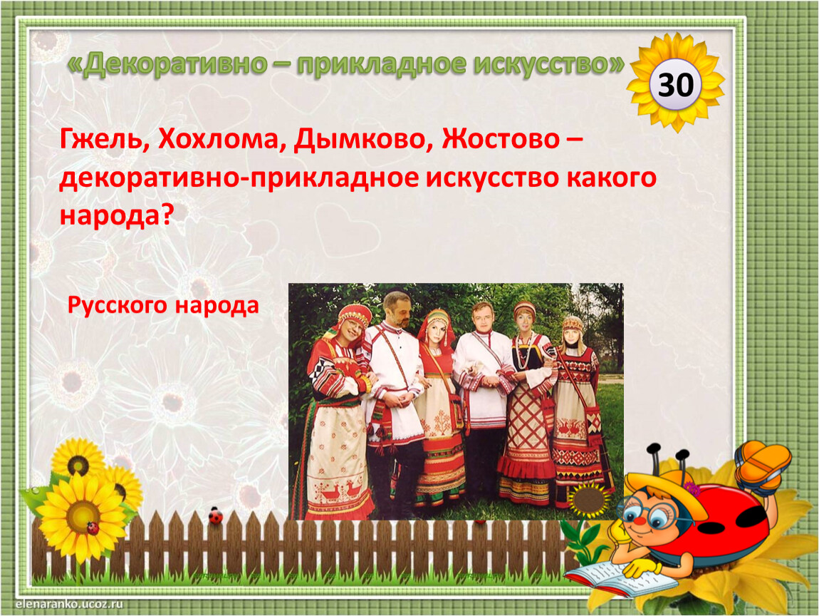 Гжель, Хохлома, Дымково, Жостово – декоративно-прикладное искусство какого народа?