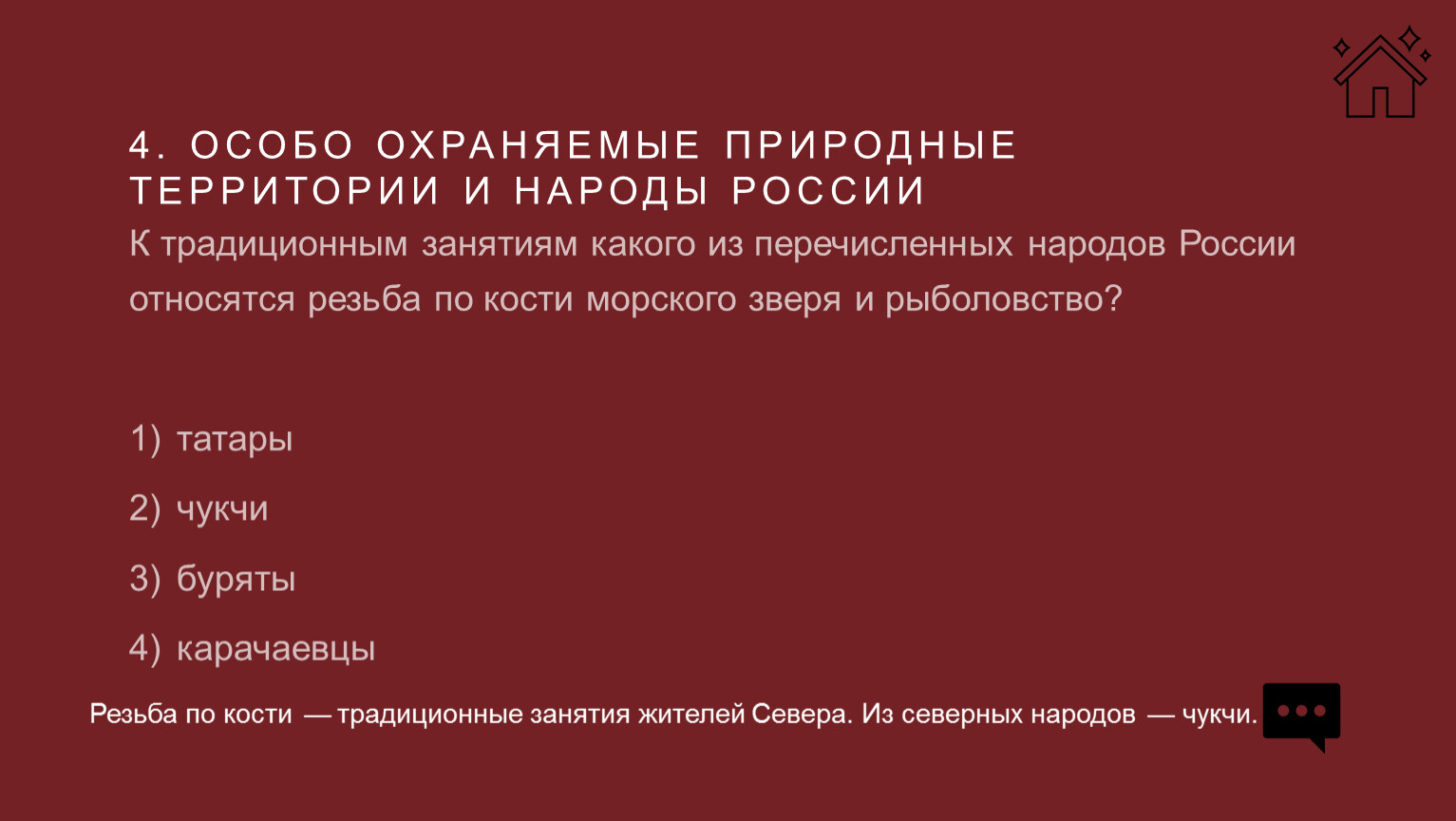 К традиционным занятиям какого из перечисленных народов России относятся резьба по кости морского зверя и рыболовство?