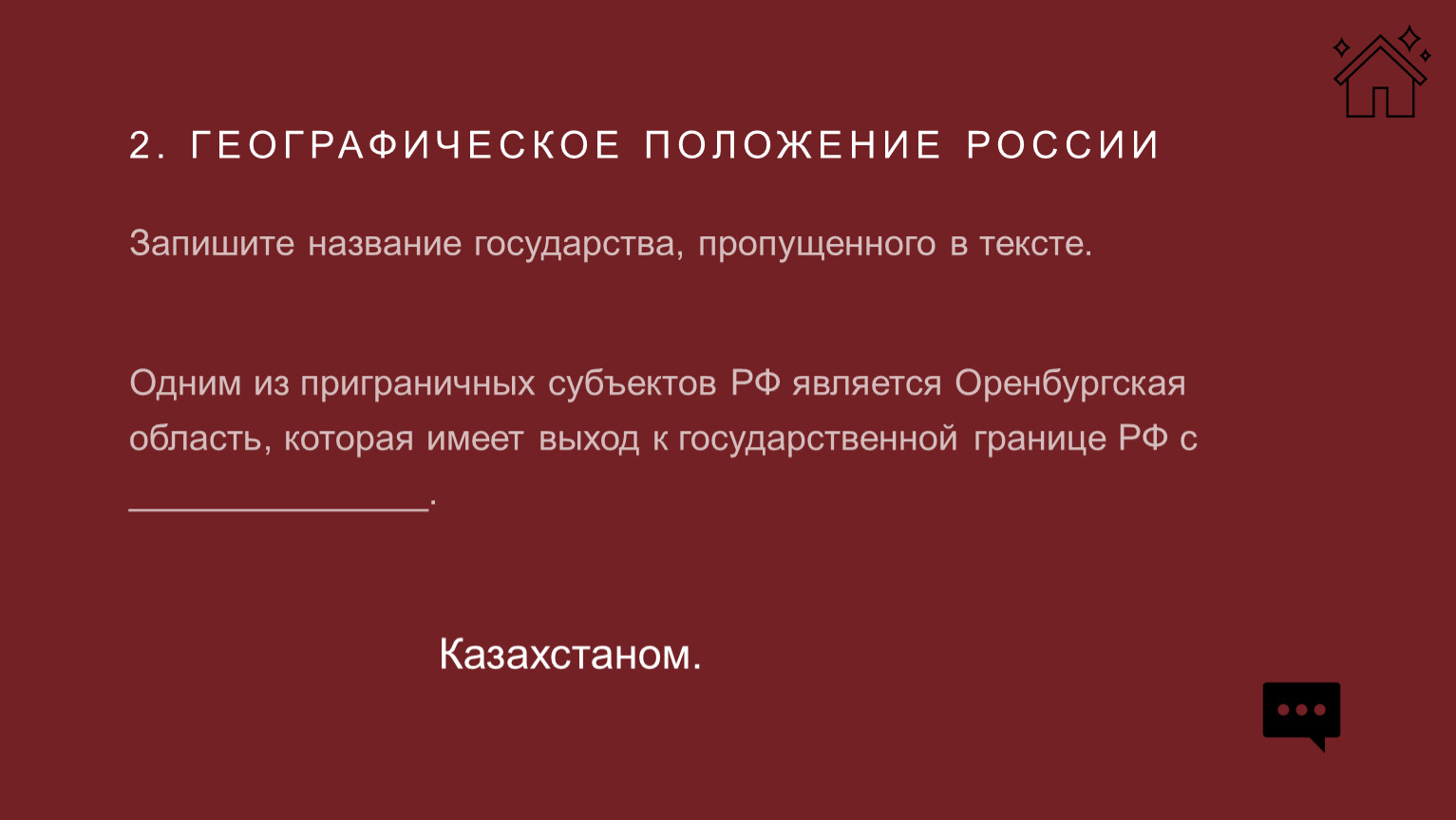 Одним из приграничных субъектов РФ является Оренбургская область, которая имеет выход к государственной границе РФ с _______________.