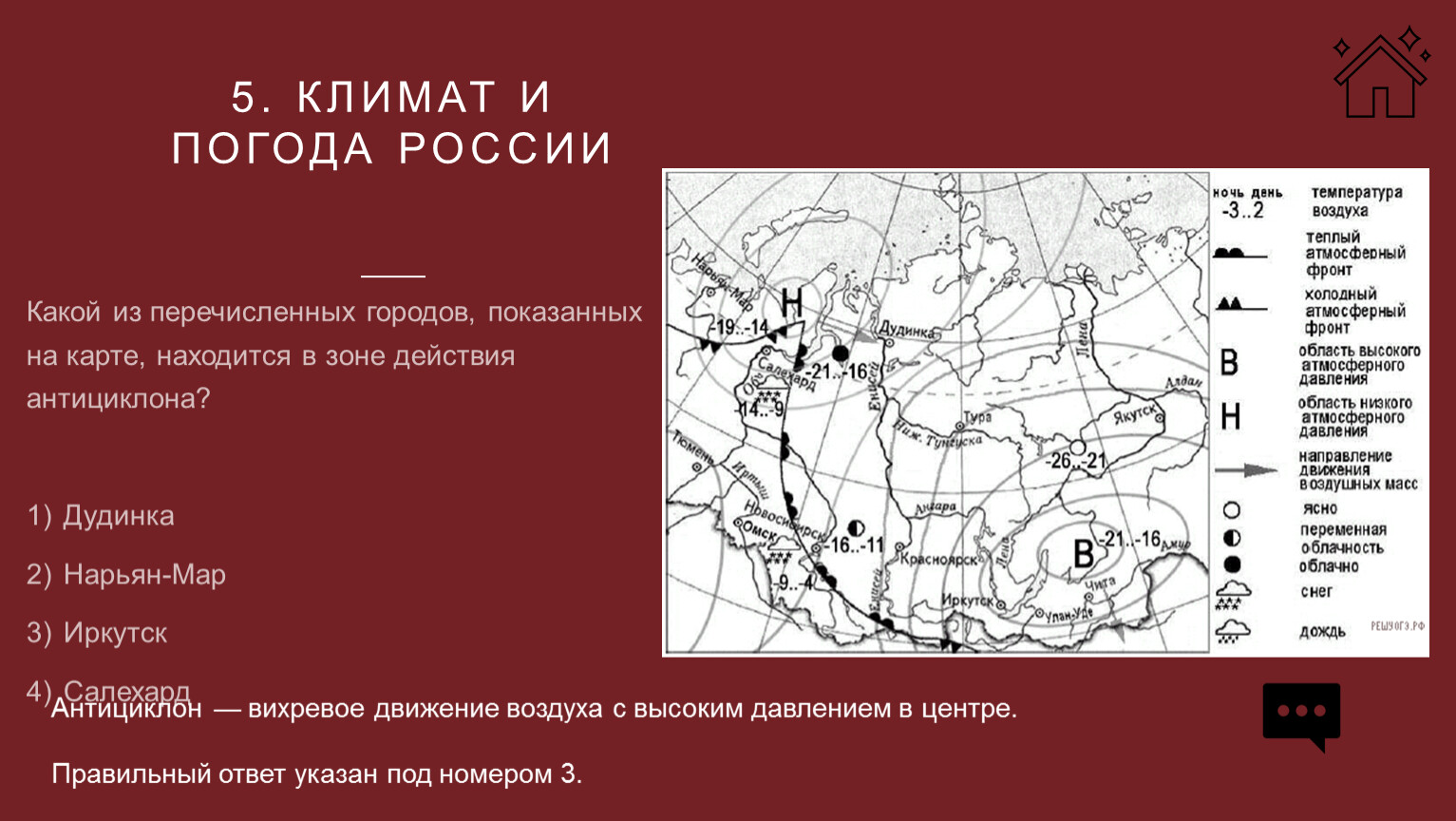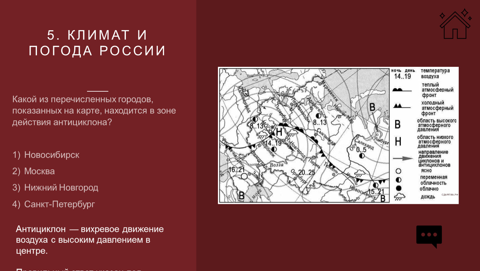 Какой из перечисленных городов, показанных на карте, находится в зоне действия антициклона?