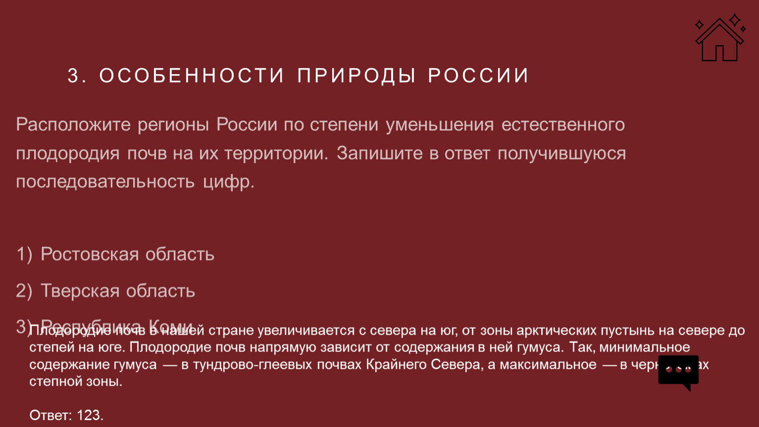 Расположите регионы России по степени увеличения естественного плодородия почв на их территории. Запишите в ответ получившуюся последовательность цифр.