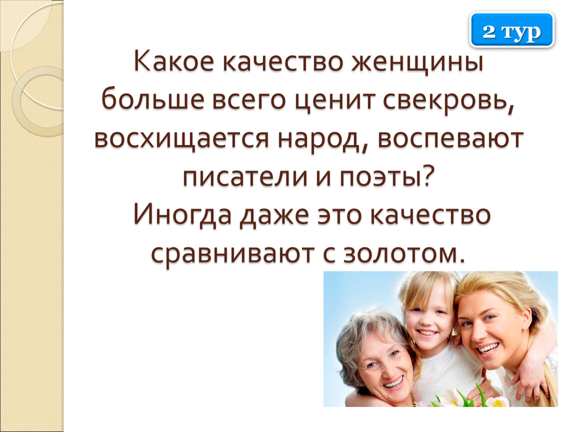 Какое качество женщины больше всего ценит свекровь, восхищается народ, воспевают писатели и поэты? Иногда даже это качество сравнивают с золотом.