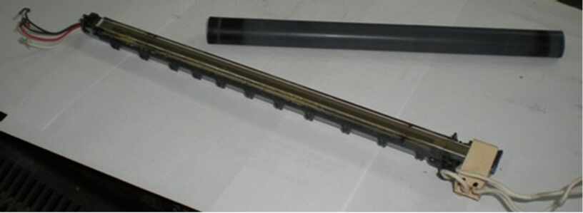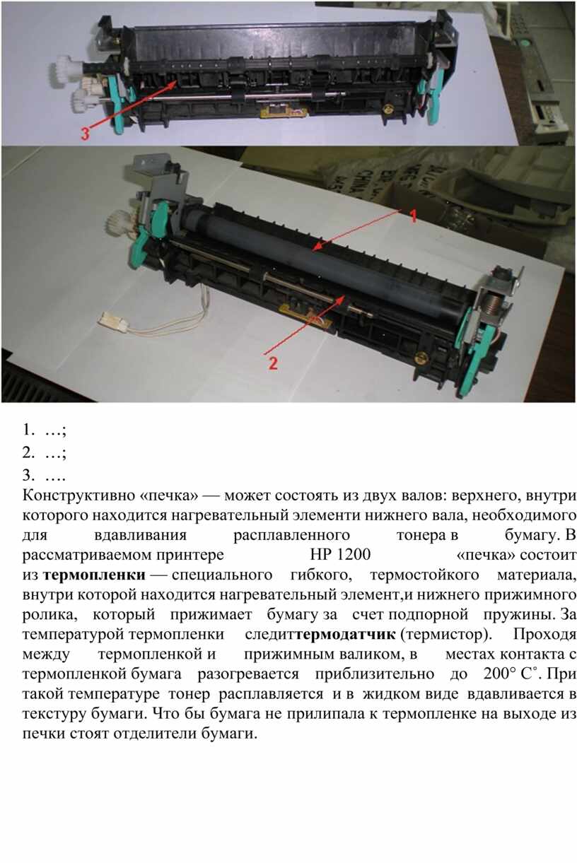 Конструктивно «печка» — может состоять из двух валов: верхнего, внутри которого находится нагревательный элементи нижнего вала, необходимого для вдавливания расплавленного тонера в бумагу. В рассматриваемом принтере НР 1200 «печка» состоит из термопленки — специального гибкого, термостойкого материала, внутри которой находится нагревательный элемент,и нижнего прижимного ролика, который прижимает бумагу за счет подпорной пружины. За температурой термопленки следиттермодатчик (термистор). Проходя между термопленкой и прижимным валиком, в местах контакта с термопленкой бумага разогревается приблизительно до 200° C˚. При такой температуре тонер расплавляется и в жидком виде вдавливается в текстуру бумаги. Что бы бумага не прилипала к термопленке на выходе из печки стоят отделители бумаги.