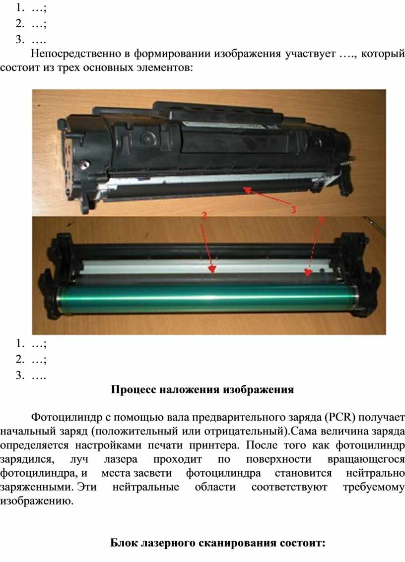 Фотоцилиндр с помощью вала предварительного заряда (PCR) получает начальный заряд (положительный или отрицательный).Сама величина заряда определяется настройками печати принтера. После того как фотоцилиндр зарядился, луч лазера проходит по поверхности вращающегося фотоцилиндра, и места засвети фотоцилиндра становится нейтрально заряженными. Эти нейтральные области соответствуют требуемому изображению.