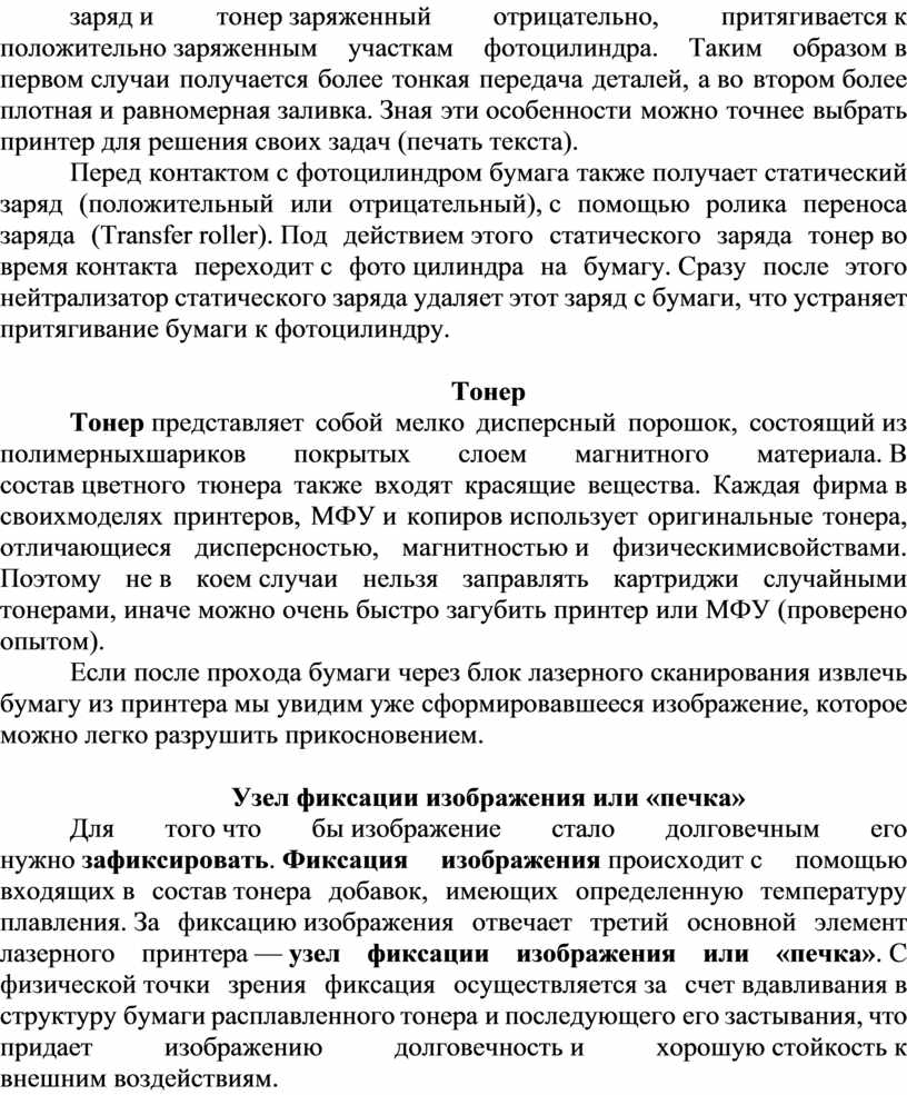 Для того что бы изображение стало долговечным его нужно зафиксировать. Фиксация изображения происходит с помощью входящих в состав тонера добавок, имеющих определенную температуру плавления. За фиксацию изображения отвечает третий основной элемент лазерного принтера — узел фиксации изображения или «печка». С физической точки зрения фиксация осуществляется за счет вдавливания в структуру бумаги расплавленного тонера и последующего его застывания, что придает изображению долговечность и хорошую стойкость к внешним воздействиям.