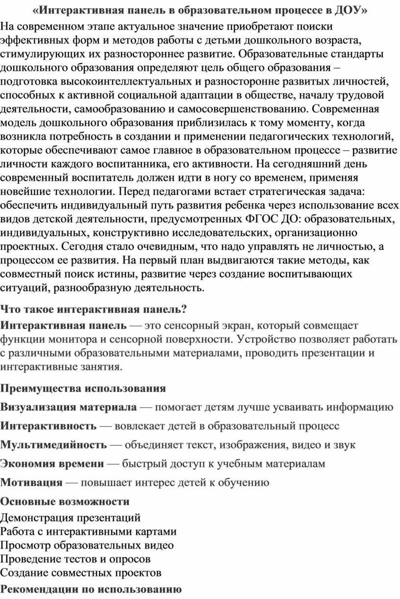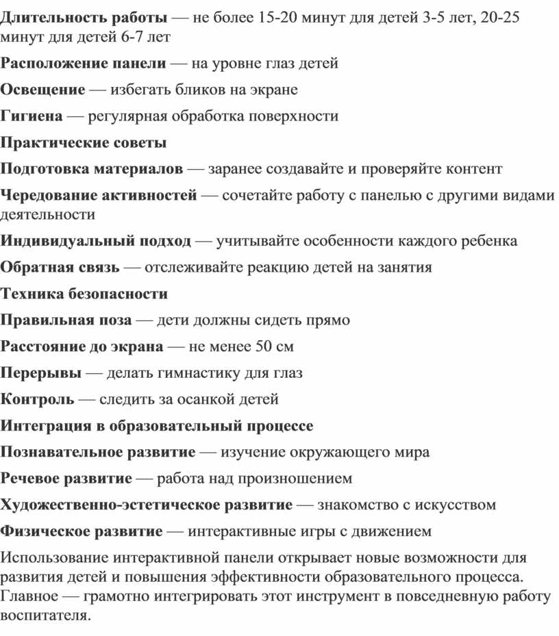 Использование интерактивной панели открывает новые возможности для развития детей и повышения эффективности образовательного процесса. Главное — грамотно интегрировать этот инструмент в повседневную работу воспитателя.