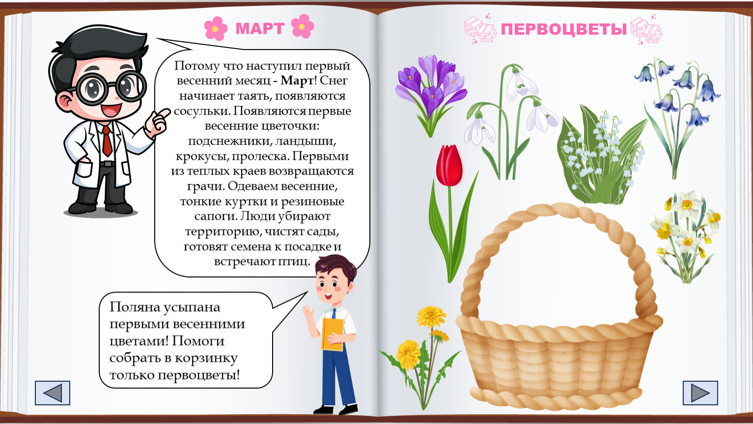 Поляна усыпана первыми весенними цветами! Помоги собрать в корзинку только первоцветы!