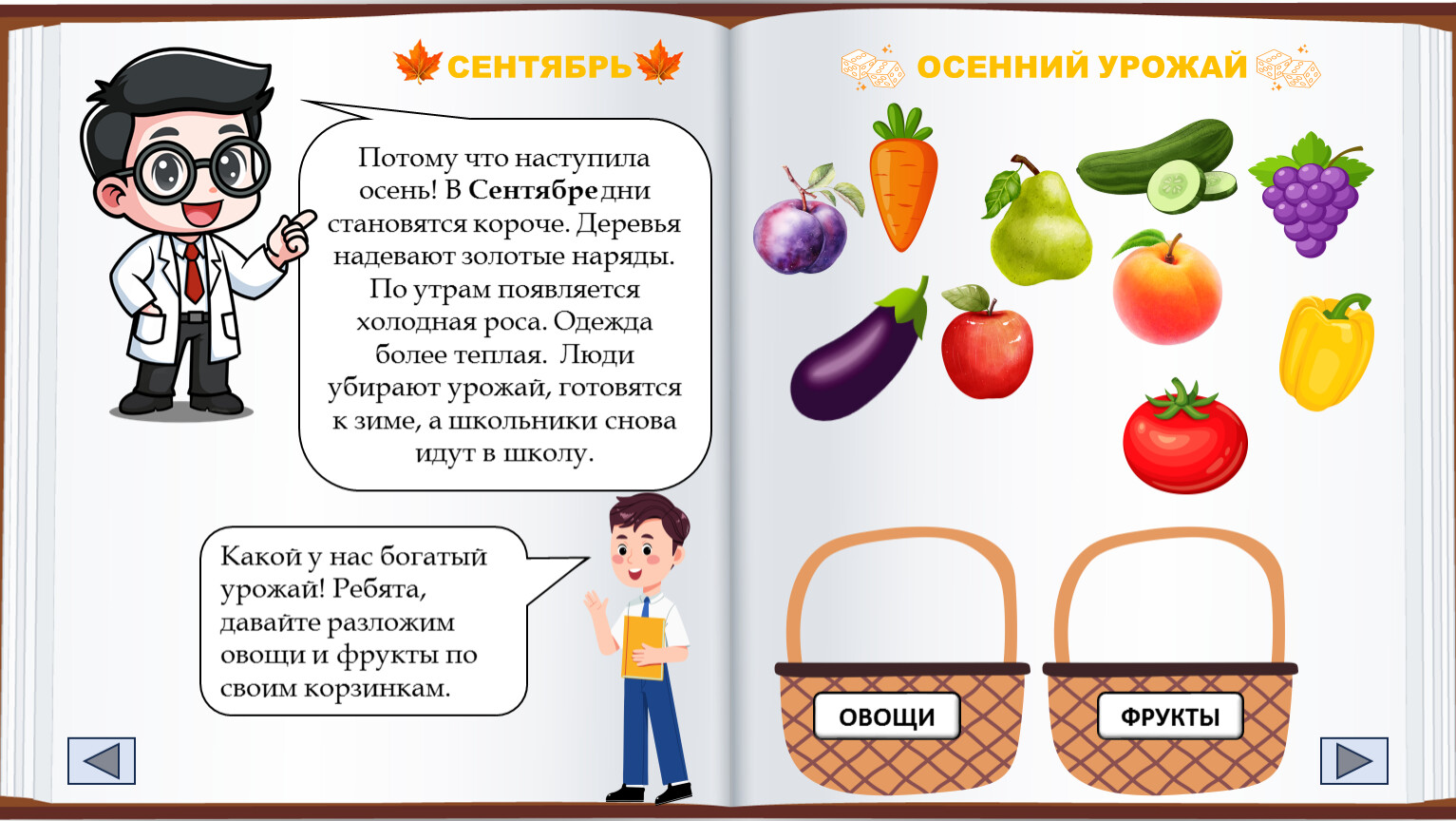 Какой у нас богатый урожай! Ребята, давайте разложим овощи и фрукты по своим корзинкам.