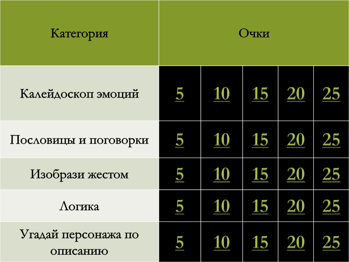 Калейдоскоп эмоций | 5 | 10 | 15 | 20 | 25 |