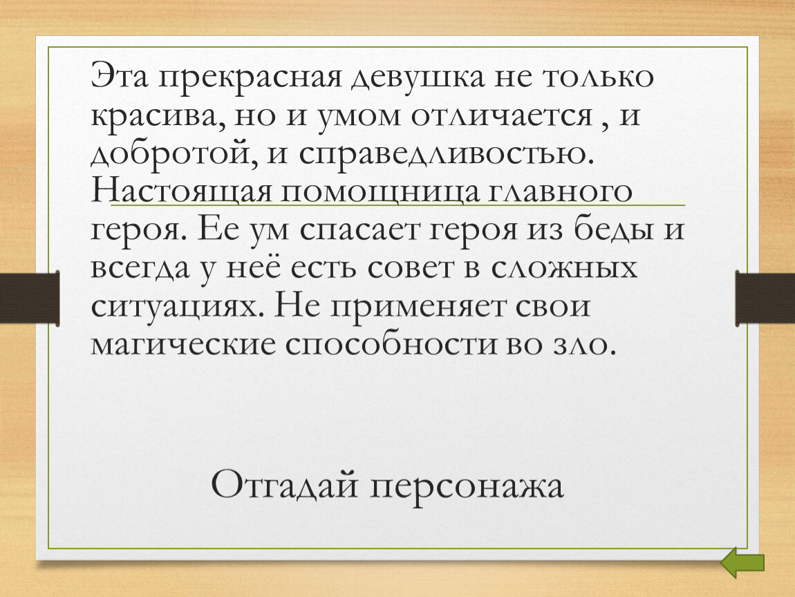Добрая, трудолюбивая, кроткая девушка, которая рано лишилась матери. Покорила сердце принца всеми своими положительными качествами.