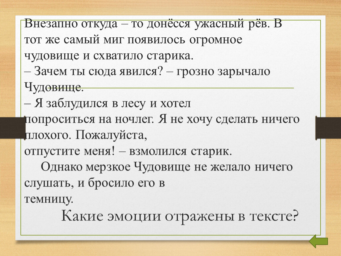 Внезапно откуда – то донёсся ужасный рёв. В тот же самый миг появилось огромное чудовище и схватило старика. – Зачем ты сюда явился? – грозно зарычало Чудовище. – Я заблудился в лесу и хотел попроситься на ночлег. Я не хочу сделать ничего плохого. Пожалуйста, отпустите меня! – взмолился старик. Однако мерзкое Чудовище не желало ничего слушать, и бросило его в темницу.
