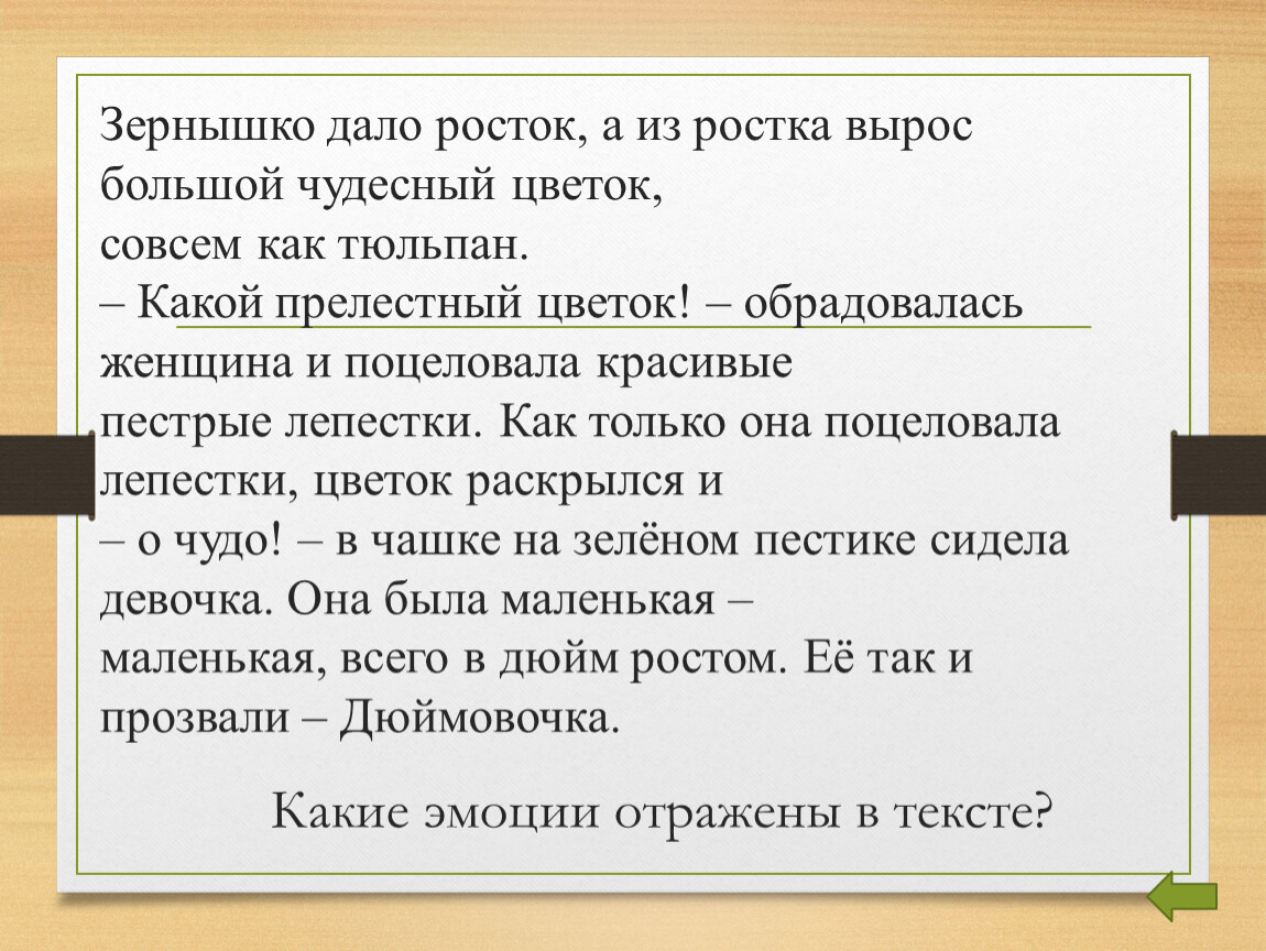 Зернышко дало росток, а из ростка вырос большой чудесный цветок, совсем как тюльпан. – Какой прелестный цветок! – обрадовалась женщина и поцеловала красивые пестрые лепестки. Как только она поцеловала лепестки, цветок раскрылся и – о чудо! – в чашке на зелёном пестике сидела девочка. Она была маленькая –маленькая, всего в дюйм ростом. Её так и прозвали – Дюймовочка.