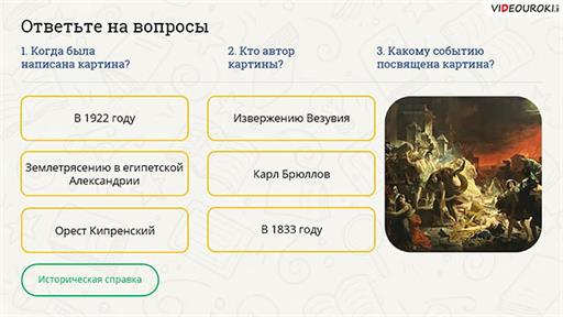 К каждому сектору с вопросами прилагается интересная информация о картине, представленной в задании. Чтобы к ней перейти, необходимо нажать кнопку «Историческая справка».