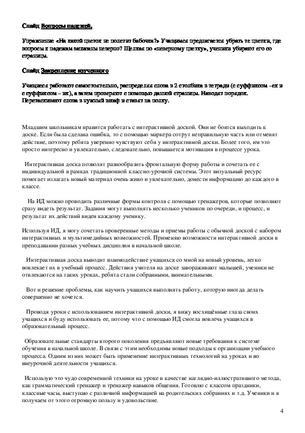 Современный человек окружен таким количеством информации, которое он не в состоянии перерабатывать и использовать для развития общества без помощи новых информационных технологий. С каждым годом все настойчивее в нашу жизнь врывается компьютер, а вместе с ним и информационные технологии. Информационные технологии дают уникальную возможность развиваться не только ученику, но и учителю. У сегодняшних учащихся потребность в визуализации информации гораздо выше. Интерактивная доска, независимо от того, для каких целей, на каком этапе урока она применяется, является инструментом визуального представления данных (нельзя забывать и о том, что в младшем школьном возрасте преобладает наглядно-действенное и налядно-образное мышление).