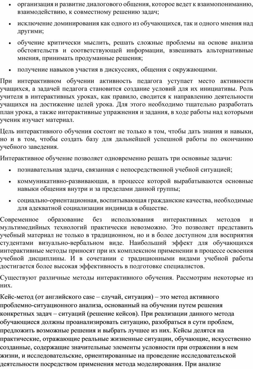 Основой интерактивных подходов к обучению является взаимодействие преподавателя и обучающихся, а также обучающихся между собой. Интерактивное обучение позволяет решать одновременно несколько задач, главной их которых является достижение целей обучения, развитие коммуникативных умений и навыков. Оно помогает установлению эмоциональных контактов между студентами, обеспечивает воспитательную задачу, поскольку приучает работать в команде, прислушиваться к мнению своих сокурсников. Использование интерактивных форм в процессе обучения, как показывает практика, снимает нервную нагрузку обучающихся, дает возможность менять формы их деятельности, переключать внимание на узловые вопросы темы занятия, и, следовательно, повышает эффективность учебно-воспитательного процесса.