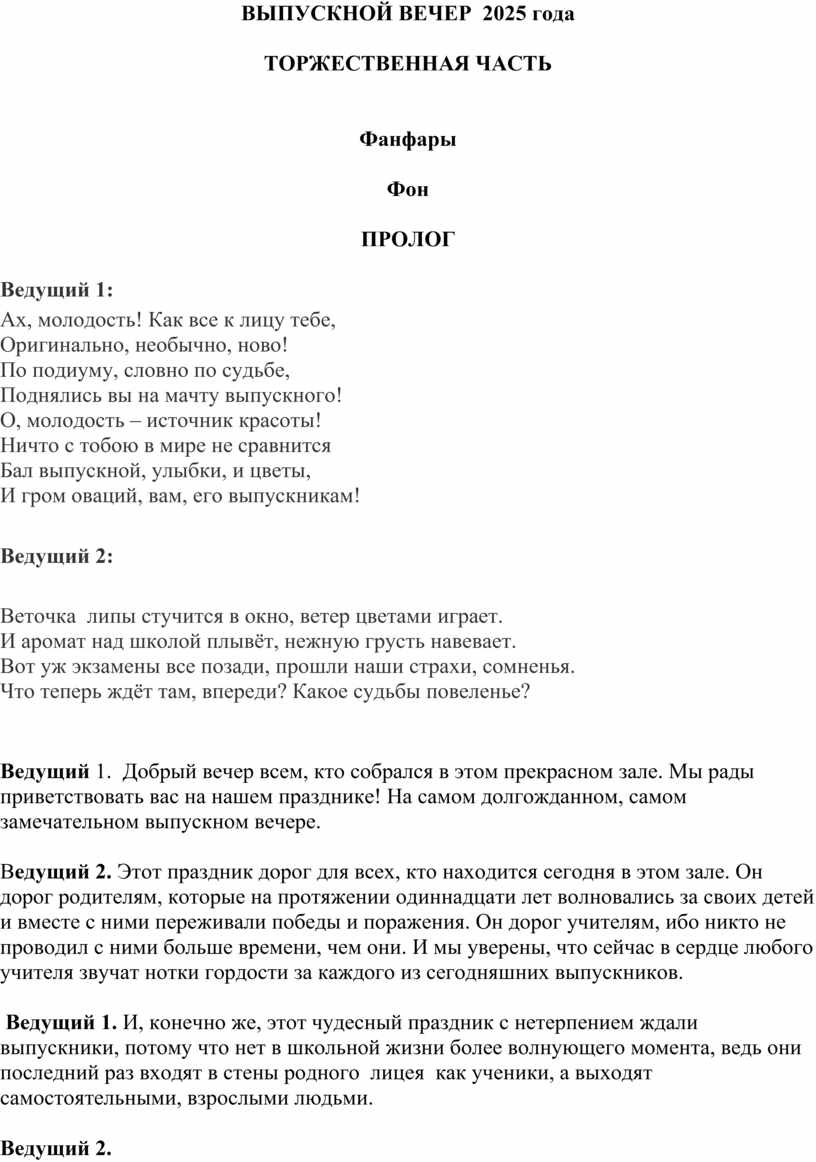 Ведущий 1. Добрый вечер всем, кто собрался в этом прекрасном зале. Мы рады приветствовать вас на нашем празднике! На самом долгожданном, самом замечательном выпускном вечере.