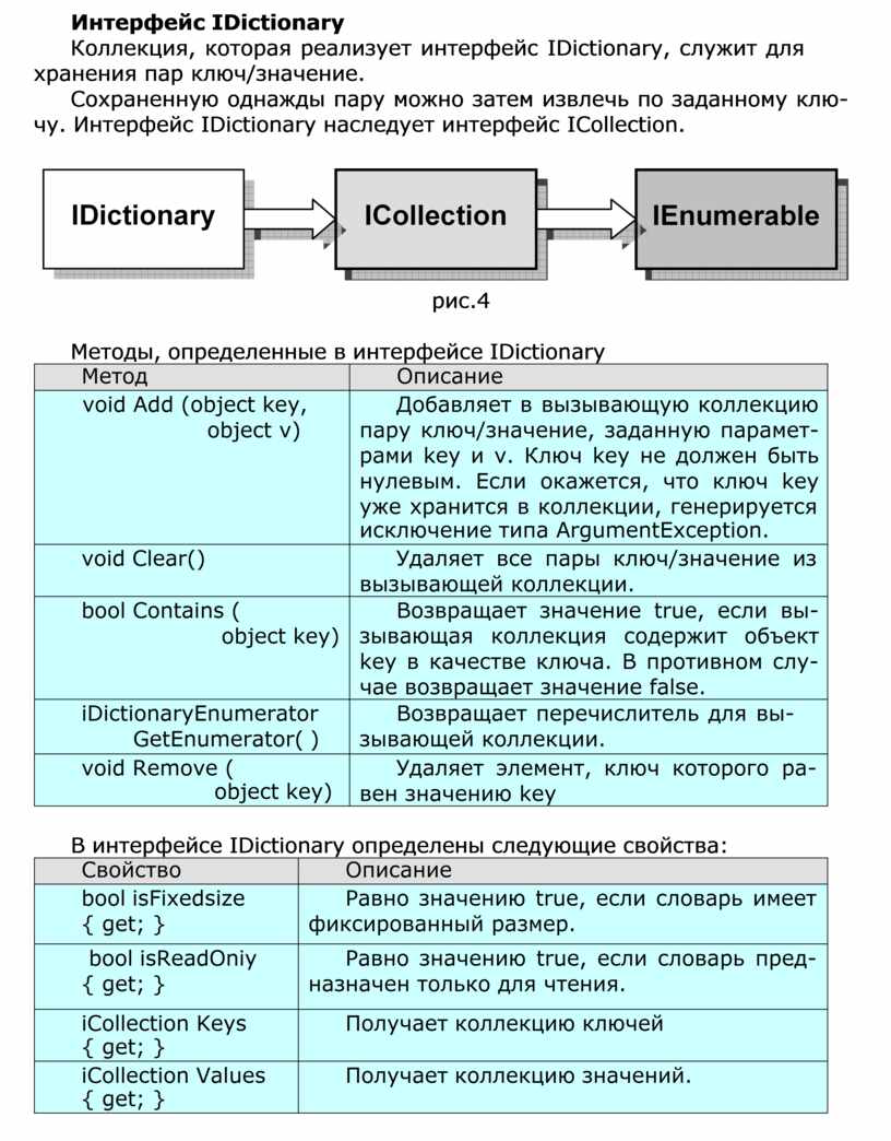 Сохраненную однажды пару можно затем извлечь по заданному клю- чу. Интерфейс IDictionary наследует интерфейс ICollection.