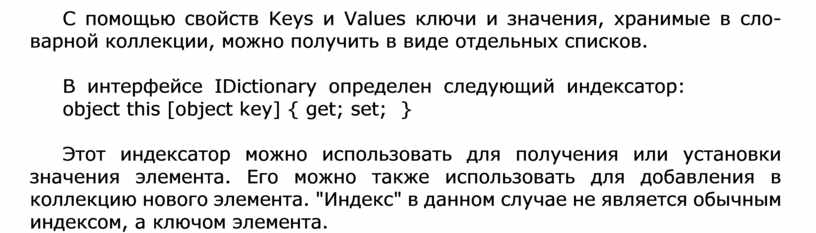 Этот индексатор можно использовать для получения или установки значения элемента. Его можно также использовать для добавления в коллекцию нового элемента. "Индекс" в данном случае не является обычным индексом, а ключом элемента.
