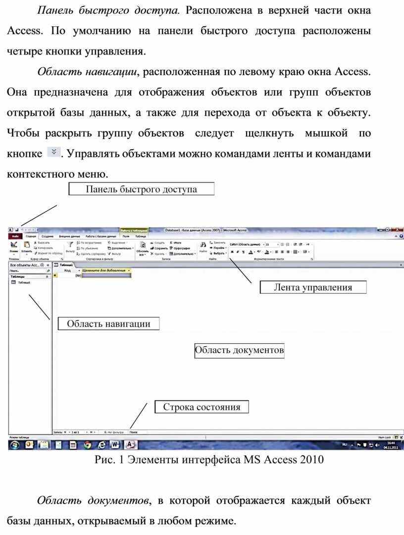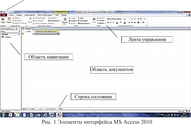 Панель быстрого доступа. Расположена в верхней части окна Access. По умолчанию на панели быстрого доступа расположены четыре кнопки управления.