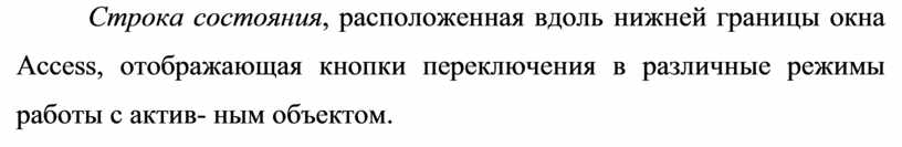 Строка состояния, расположенная вдоль нижней границы окна Access, отображающая кнопки переключения в различные режимы работы с актив- ным объектом.