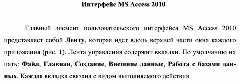 Главный элемент пользовательского интерфейса MS Access 2010 представляет собой Ленту, которая идет вдоль верхней части окна каждого приложения (рис. 1). Лента управления содержит вкладки. По умолчанию их пять: Файл, Главная, Создание, Внешние данные, Работа с базами дан- ных. Каждая вкладка связана с видом выполняемого действия.