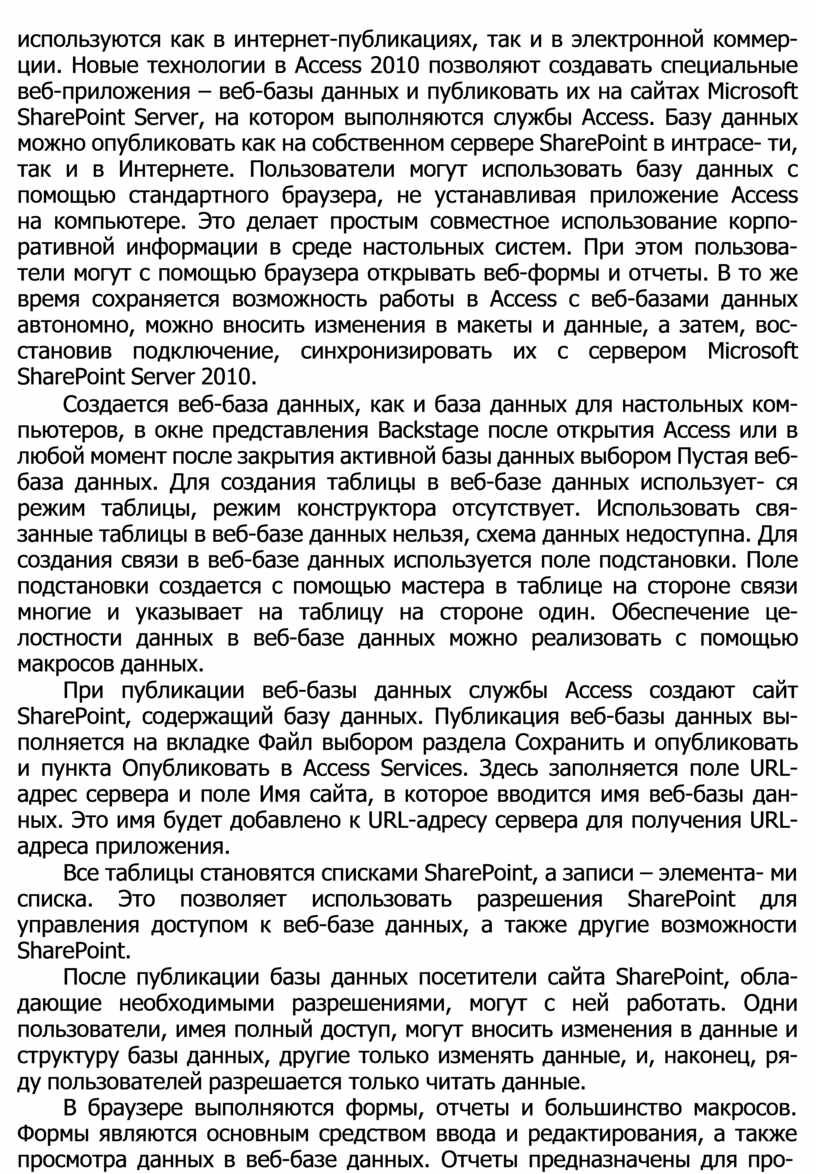 используются как в интернет-публикациях, так и в электронной коммер- ции. Новые технологии в Access 2010 позволяют создавать специальные веб-приложения – веб-базы данных и публиковать их на сайтах Microsoft SharePoint Server, на котором выполняются службы Access. Базу данных можно опубликовать как на собственном сервере SharePoint в интрасе- ти, так и в Интернете. Пользователи могут использовать базу данных с помощью стандартного браузера, не устанавливая приложение Access на компьютере. Это делает простым совместное использование корпо- ративной информации в среде настольных систем. При этом пользова- тели могут с помощью браузера открывать веб-формы и отчеты. В то же время сохраняется возможность работы в Access с веб-базами данных автономно, можно вносить изменения в макеты и данные, а затем, вос- становив подключение, синхронизировать их с сервером Microsoft SharePoint Server 2010.