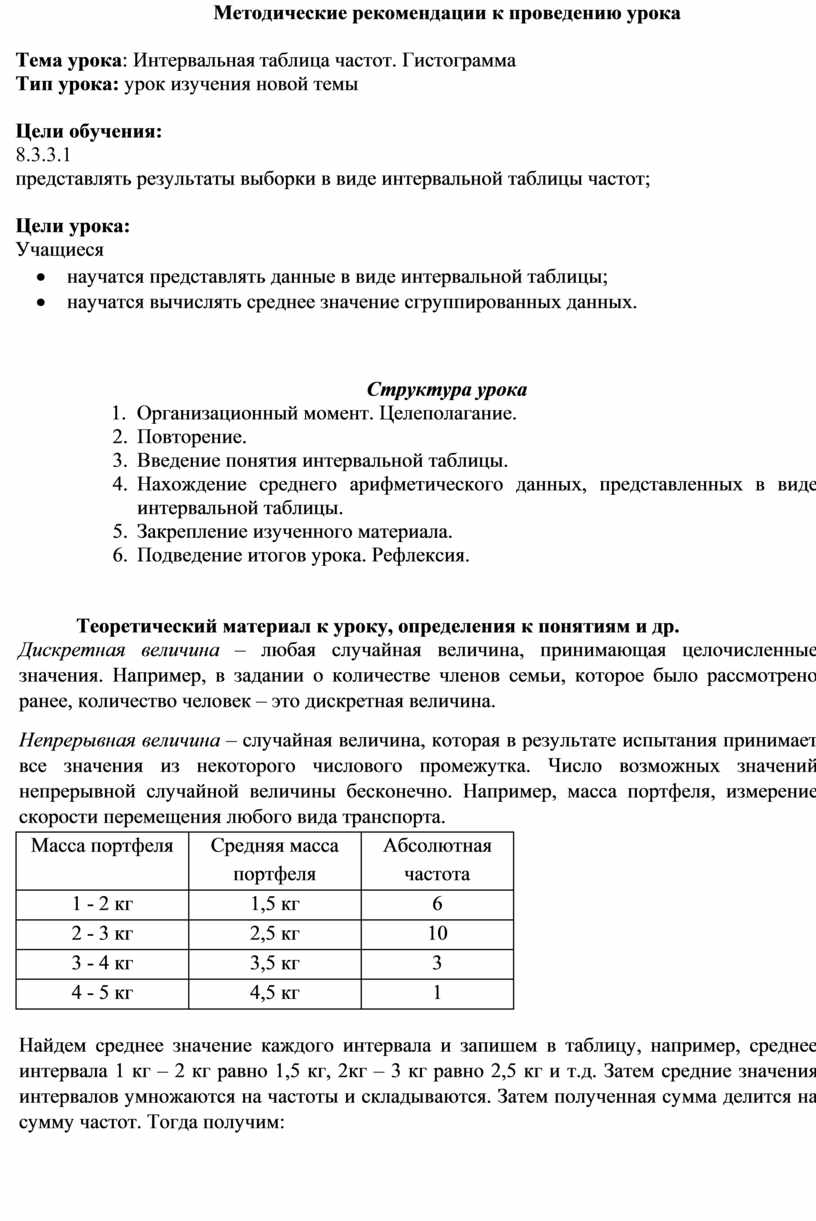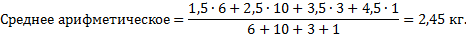 Найдем среднее значение каждого интервала и запишем в таблицу, например, среднее интервала 1 кг – 2 кг равно 1,5 кг, 2кг – 3 кг равно 2,5 кг и т.д. Затем средние значения интервалов умножаются на частоты и складываются. Затем полученная сумма делится на сумму частот. Тогда получим: