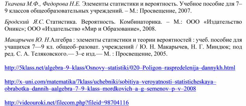 Ткачева М.Ф., Федорова Н.Е. Элементы статистики и вероятность. Учебное пособие для 7–9 классов общеобразовательных учреждений. – М.: Просвещение, 2007.