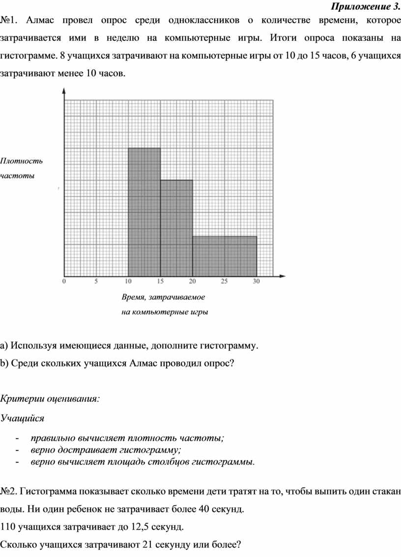 №1. Алмас провел опрос среди одноклассников о количестве времени, которое затрачивается ими в неделю на компьютерные игры. Итоги опроса показаны на гистограмме. 8 учащихся затрачивают на компьютерные игры от 10 до 15 часов, 6 учащихся затрачивают менее 10 часов.