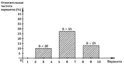Теперь изобразим три прямоугольника. Основание первого — это отрезок [2; 4], его площадь равна 8, т. е. равна абсолютной частоте «плохой» варианты. Аналогично поступим с двумя другими вариантами. Таким образом, получим столбчатую диаграмму, или гистограмму распределения абсолютных частот.