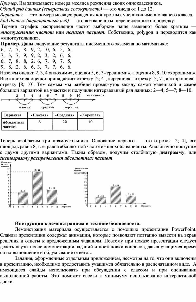 Назовем оценки 2, 3, 4 «плохими», оценки 5, 6, 7 «средними», а оценки 8, 9, 10 «хорошими». Все «плохие» оценки принадлежат отрезку [2; 4], «средние» - отрезку [5; 7], а «хорошие» - отрезку [8; 10]. Тем самым мы разбили промежуток между самой маленькой и самой большой вариантой на участки и получили интервальный ряд данных: 2—4; 5—7; 8—10.