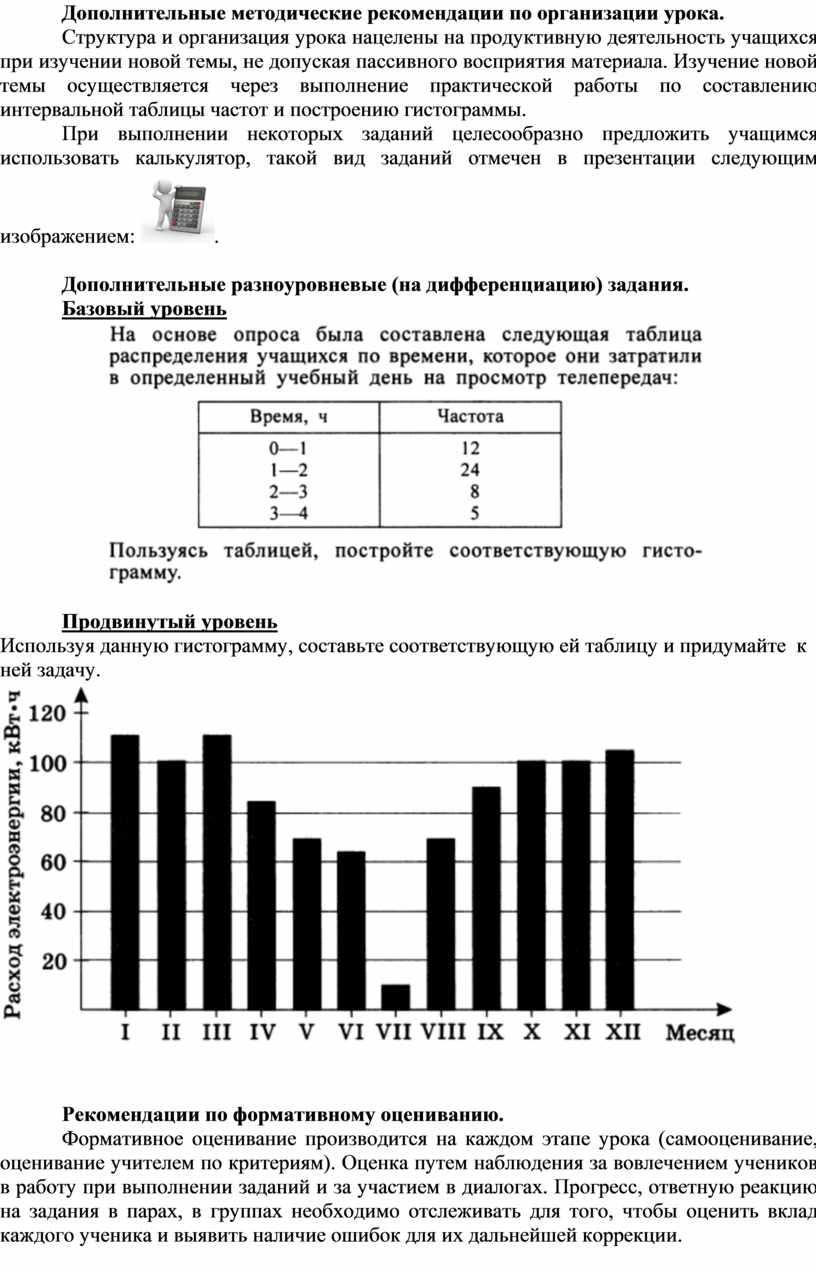 Структура и организация урока нацелены на продуктивную деятельность учащихся при изучении новой темы, не допуская пассивного восприятия материала. Изучение новой темы осуществляется через выполнение практической работы по составлению интервальной таблицы частот и построению гистограммы.