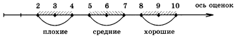 Назовем оценки 2, 3, 4 «плохими», оценки 5, 6, 7 «средними», а оценки 8, 9, 10 «хорошими». Все «плохие» оценки принадлежат отрезку [2; 4], «средние» - отрезку [5; 7], а «хорошие» - отрезку [8; 10]. Тем самым мы разбили промежуток между самой маленькой и самой большой вариантой на участки и получили интервальный ряд данных: 2—4; 5—7; 8—10.