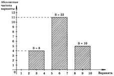 Теперь изобразим три прямоугольника. Основание первого — это отрезок [2; 4], его площадь равна 8, т. е. равна абсолютной частоте «плохой» варианты. Аналогично поступим с двумя другими вариантами. Таким образом, получим столбчатую диаграмму, или гистограмму распределения абсолютных частот.