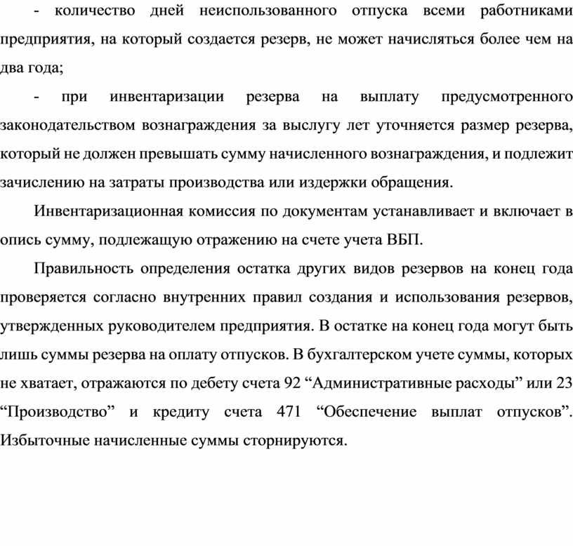 - количество дней неиспользованного отпуска всеми работниками предприятия, на который создается резерв, не может начисляться более чем на два года;