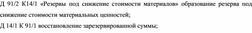 Д 91/2 К14/1 «Резервы под снижение стоимости материалов» образование резерва под снижение стоимости материальных ценностей;